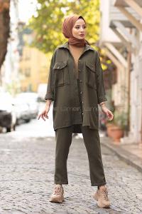 Lamelif Yaka Detay İkili Tesettür Takım Haki