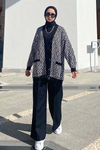 Modalamelif Çift Cepli Renk Garnili Desenli Triko Hırka Siyah-Beyaz