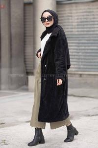 Modalamelif Çift Cepli Uzun Peluş Kaban Siyah