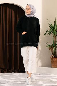 Lamelif Beyaz Çizgili Triko Kazak Siyah