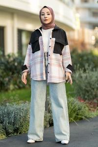 Modalamelif Çift Kapak Cepli Renk Garnili Oduncu Gömlek Pudra-Siyah