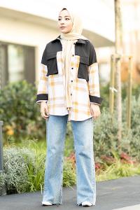 Modalamelif Çift Kapak Cepli Renk Garnili Oduncu Gömlek Siyah-Hardal