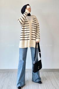 Modalamelif Çizgi Desenli Renk Garnili Basic Hırka Çağla Ekru