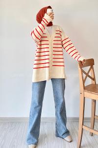 Modalamelif Çizgi Desenli Renk Garnili Basic Hırka Kırmızı