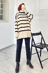 Lamelif Beyaz Çizgili Triko Kazak Siyah
