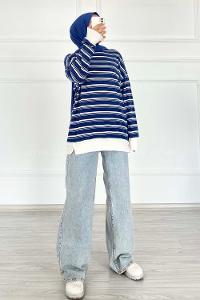 Modalamelif Çizgi Şeritli Desen Bisiklet Yaka Sweat Lacivert