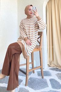 Modalamelif Çizgi Şeritli Salaş Triko Tunik Sütlükahve