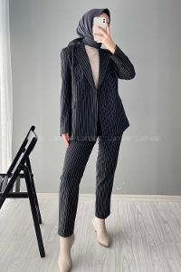 Modalamelif Çizgili Ceket Pantolon İkili Takım Siyah