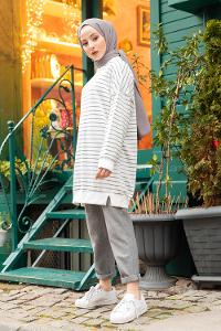 Lamelif Çizgi Detaylı İki İplik Sweat Beyaz