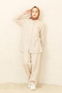 Lamelif Yan Çizgili Panço Tesettür Takım Bej