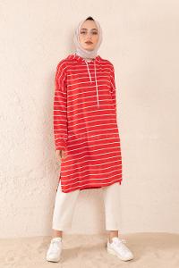 Modalamelif Çizgili Kapşonlu Tunik Kırmızı