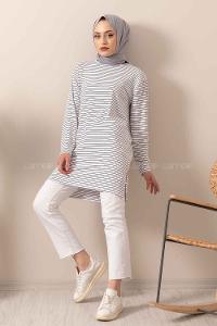 Modalamelif Çizgili Yırtmaçlı Tunik Beyaz