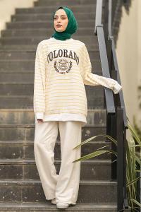 Lamelif Kolu Çizgi Detaylı Kapüşonlu Sweat Ekru