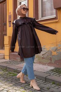 Modalamelif Deri Görünümlü Fırfırlı Gömlek Acı Kahve
