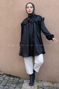 Modalamelif Deri Görünümlü Fırfırlı Gömlek Siyah
