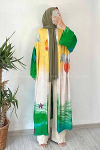 Modalamelif Desen Baskılı Kuşak Bağlamalı Kimono Sarı