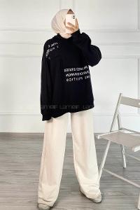 Modalamelif Dikişli Salaş Yazı Baskılı Sweatshırt Siyah