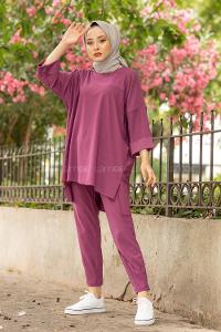 Lamelif Düz Bisiklet Yaka Takım Koyu Vizonrengi