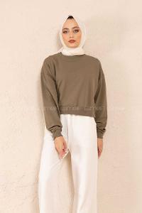 Modalamelif Düz Renk Crop Sweatshirt Haki