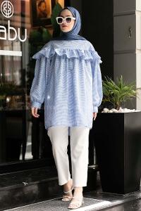Lamelif Flores Fırfırlı Tunik Saks Mavisi