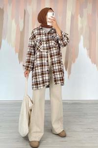 Modalamelif Ekose Desen Çift Cepli Önü Boydan Düğmeli Ceket Kahverengi