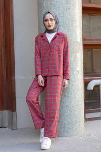 Modalamelif Ekose Desen İkili Pijama Takım Kırmızı