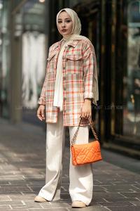 Modalamelif Ekose Desenli Çift Cepli Oduncu Gömlek Sütlü Kahve-Turuncu