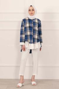 Modalamelif Ekose Desenli Hakim Yaka Fırfırlı Gömlek Saks Mavisi