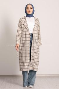 Modalamelif Ekose Desenli Kışak Bağlamalı Cep Detaylı Hırka Haki-Bej