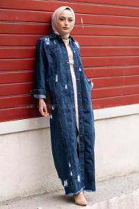 Modalamelif Eskitme İşlemeli Boydan Düğmeli Elbise Koyu Mavi