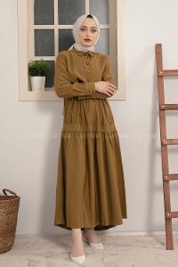 Lamelif Balon Kol Katlı Tesettür Elbise Yağ Yeşili