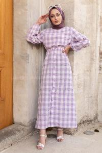 Modalamelif Eteği Dümeli Kareli Gofre Elbise Lila
