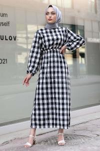 Modalamelif Eteği Dümeli Kareli Gofre Elbise Siyah