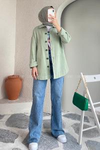 Modalamelif Eteği Parçalı Düğme Detaylı Salaş Gömlek Çağla Yeşili
