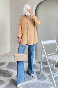 Modalamelif Eteği Parçalı Düğme Detaylı Salaş Gömlek Camel