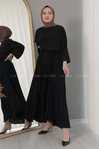 Lamelif Balon Kol Katlı Tesettür Elbise Siyah