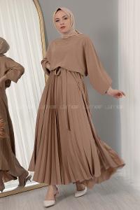 Lamelif Balon Kol Katlı Tesettür Elbise Acı Kahve