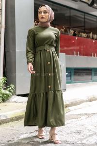 Modalamelif Eteği Yarım Düğmeli Kaplama Kemerli Elbise Haki