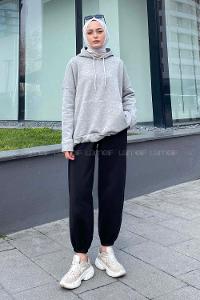 Modalamelif Etek Ucu Bağcıklı Kanguru Cep Sweatshirt Gri