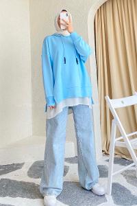 Modalamelif Etek Ucu Garnili Kapüşon Detaylı Yırtmaçlı Anabelle Sweat Açık Mavi