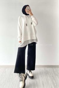 Modalamelif Etek Ucu Garnili Kapüşon Detaylı Yırtmaçlı Anabelle Sweat Beyaz