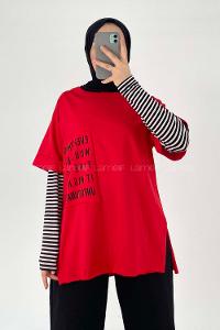 Modalamelif Everything Baskılı Duble Kol Yan Yırtmaçlı T-Shirt Kırmızı