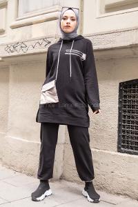 Lamelif Bisiklet Yaka Ribanalı İkili Eşofman Tesettür Takım Siyah