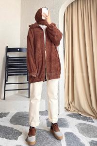 Modalamelif Fermuar Detaylı Peluş Hırka Kahverengi