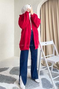 Modalamelif Fermuar Detaylı Peluş Hırka Kırmızı