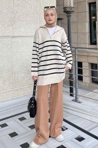 Lamelif Fermuarlı Çizgili Uzun Kazak Bej -Siyah