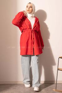 Modalamelif Fermuarlı Kapşonlu Gabardin Ceket Kırmızı