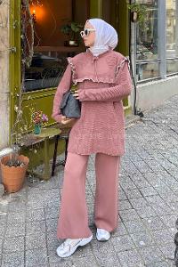 Lamelif Fırfırlı Triko İkili Tesettür Takım Gül