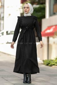 Lamelif Balon Kol Katlı Tesettür Elbise Siyah