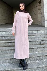 Lamelif Fitilli Triko Uzun Tesettür Elbise Pudra